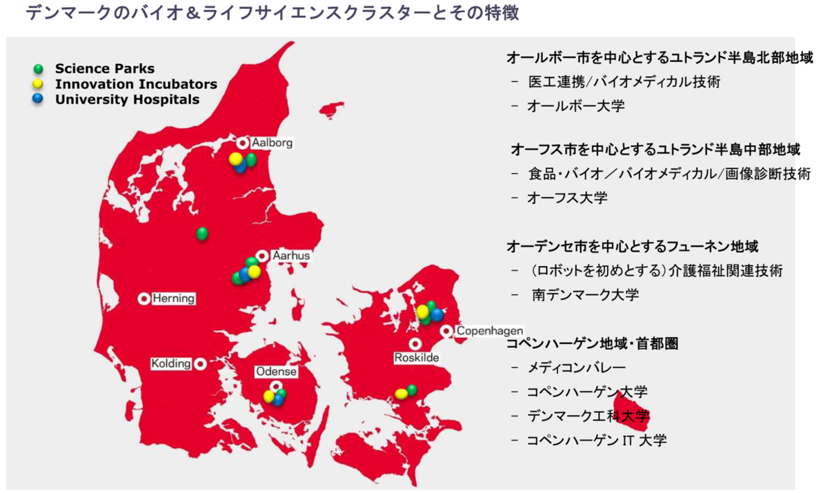 | 発信情報1 | バイオクラスター紹介 【Biotechnology Innovation Organization】 ■デンマークのバイオ&ライフサイエンスクラスターとその特徴・オールボー市を中心とするユトランド半島北部地域 - 医工連携/バイオメディカル技術:オールボー大学 ・オーフス市を中心とするユトランド半島中部地域 - 食品・バイオ/バイオメディカル/画像診断技術:オーフス大学 ・オーデンセ市を中心とするフューネン地域 - (ロボットを初めとする)介護福祉関連技術:南デンマーク大学 ・コペンハーゲン地域・首都圏 - メディコンバレー、コペンハーゲン大学、デンマーク工科大学、コペンハーゲンIT大学 【Medicon Valley & Medicon Valley Alliance】 Medicon Valleyは、デンマークの首都圏(Greater Copenhagen)およびスウェーデンのスコーネ地方にまたがるデンマーク最大のクラスター。ここに位置するライフサイエンス関連事業団体(企業、大学、病院、公的機関など)を統括する非営利団体がMedicon Valley Allianceです。 ■主だったサイエンスパーク ・ユトランド半島北部地域(NOVI Science Park) ・ユトランド半島中部地域(INCUBA) ・フューネン地域(Science Park of Southern Denmark) ・コペンハーゲン・首都圏(Medicon Valley) - Symbion Science Park | DTU Science Park | CAT Science Park | Copenhagen Bio Science Park |